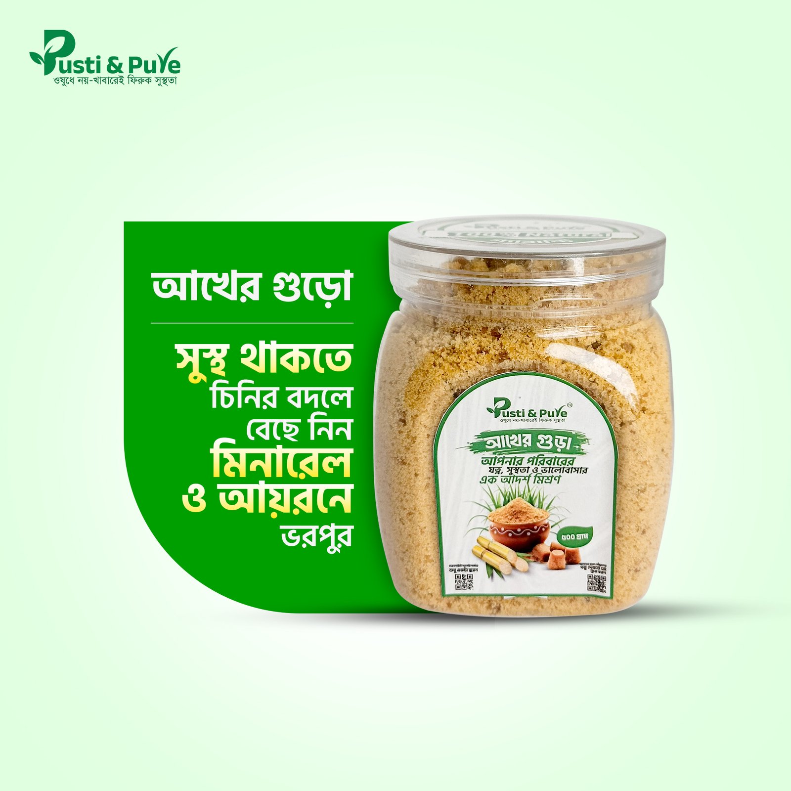 আঁখের গুড়ের গুঁড়া – সাদা চিনির স্বাস্থ্যকর বিকল্প। আখের রস ফুটিয়ে তৈরি, কোনো কেমিক্যাল বা প্রক্রিয়াজাত নয়।